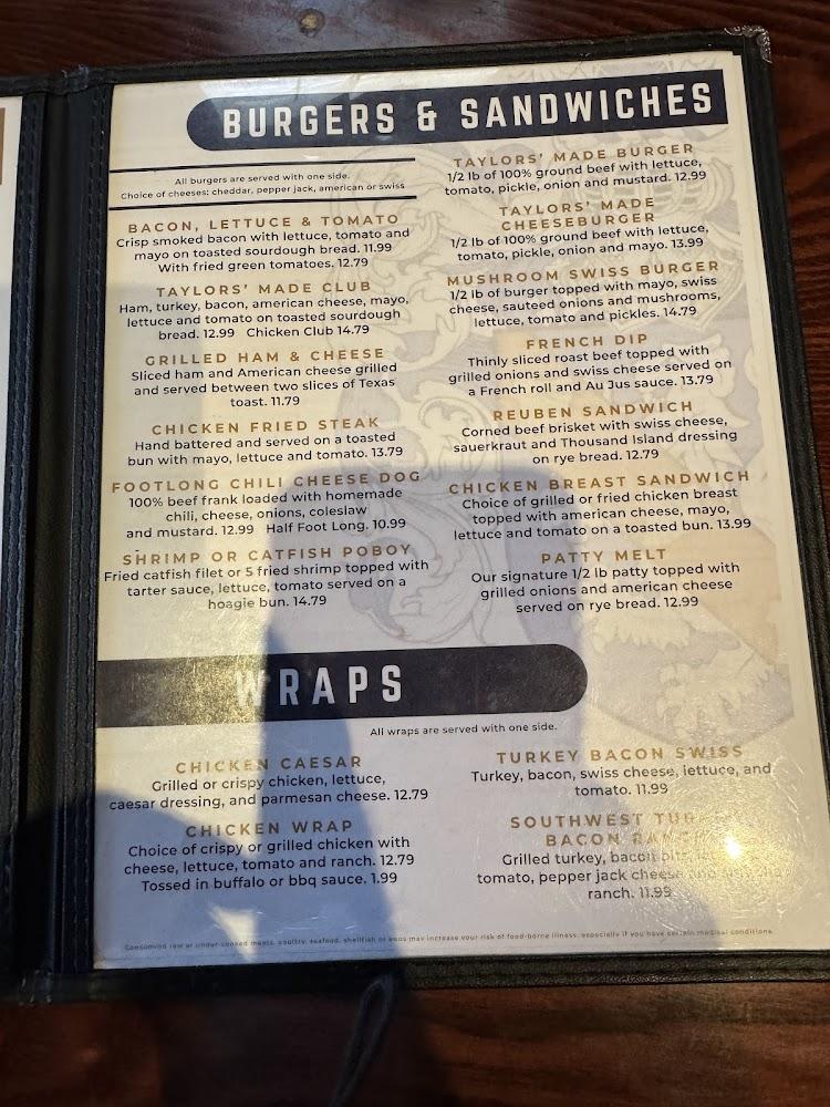 Taylor's Made offers a diverse American menu tailored to cater to various palates. Appetizers like the chicken quesadilla and pork rinds bring bold flavors to the table. Salads range from hearty chicken chef to vibrant salmon, perfect for lighter appetites. Entrees include classic dishes like the smothered steak and delicious fried catfish. Each plate highlights local ingredients whenever possible.